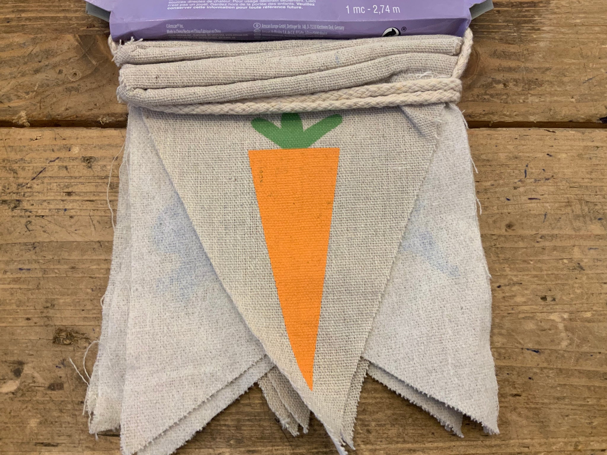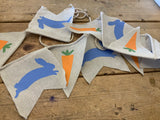 A decorative fabric bunting with a cheerful mix of carrots and blue bunnies printed on hessian fabric.
