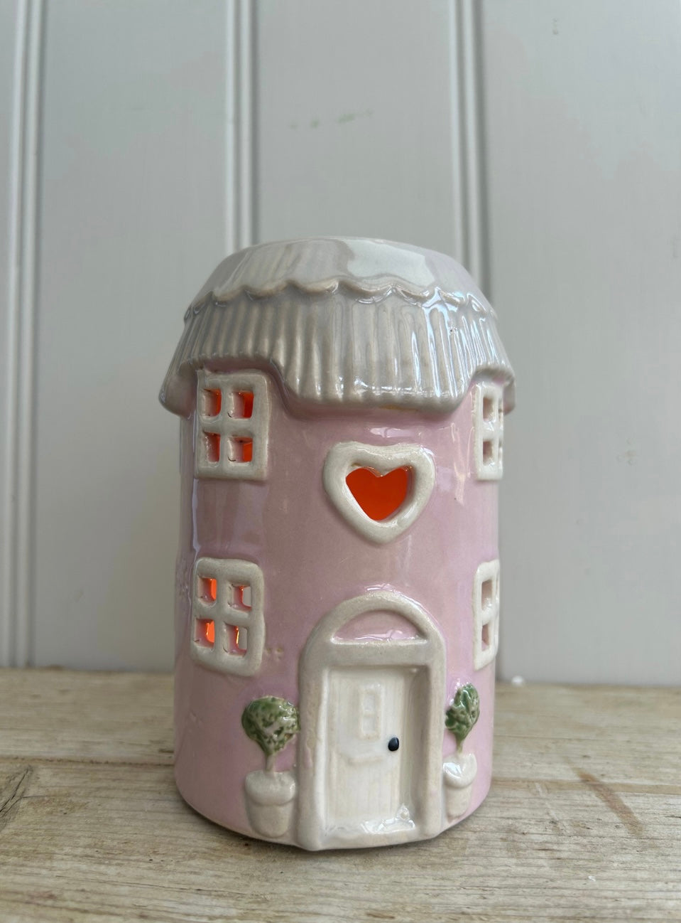 The house is decorated with 2 cute topiary trees either side of the door and a lovely cut out heart above the door.